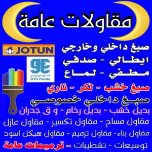 المقاول عام متخصص في أعمال الصبغ هو مقاول متخصص في أعمال المقاولات والتشطيبات النهائية ويقوم بعمل بصباغة الحوائط والجدران في الغرف. مقاول عام يعمل تحت إشراف مجموعة من الفنيين الصباغيين. يقوم مقاول عام بأعمال الصباغة وجميع الأمور المتعلقة بالدهانات المختلفة. يستخدم مقاول عام مواد ودهانات على أعلى جودة. كما يستخدم مقاول عام العديد من معدات الصباغة اللازمة الحديثة ، كما أنه يسلم المشروع بتشطيبات صباغة كاملة لا ينقصها شيء. للتواصل مع رقم مقاول عام.